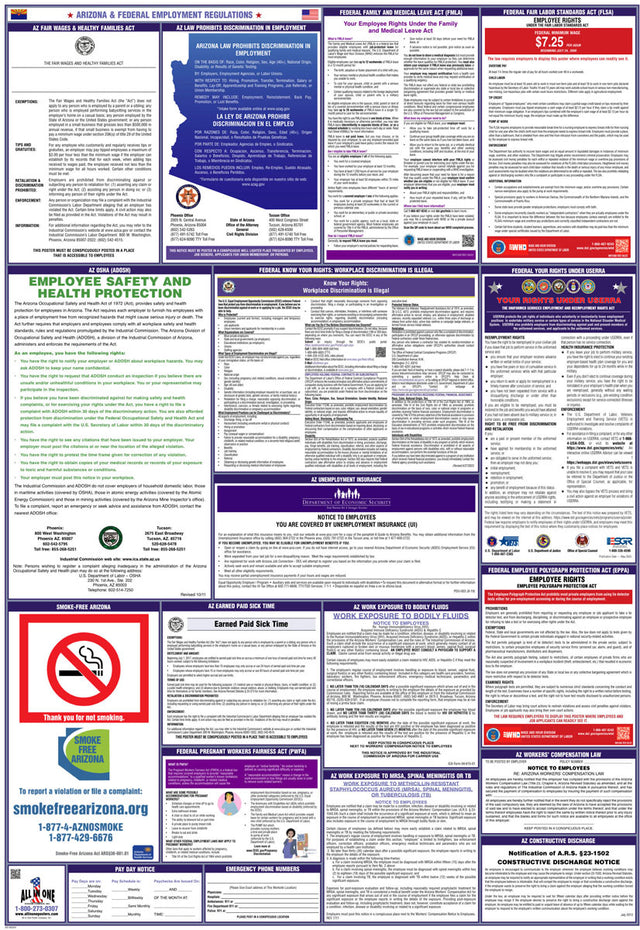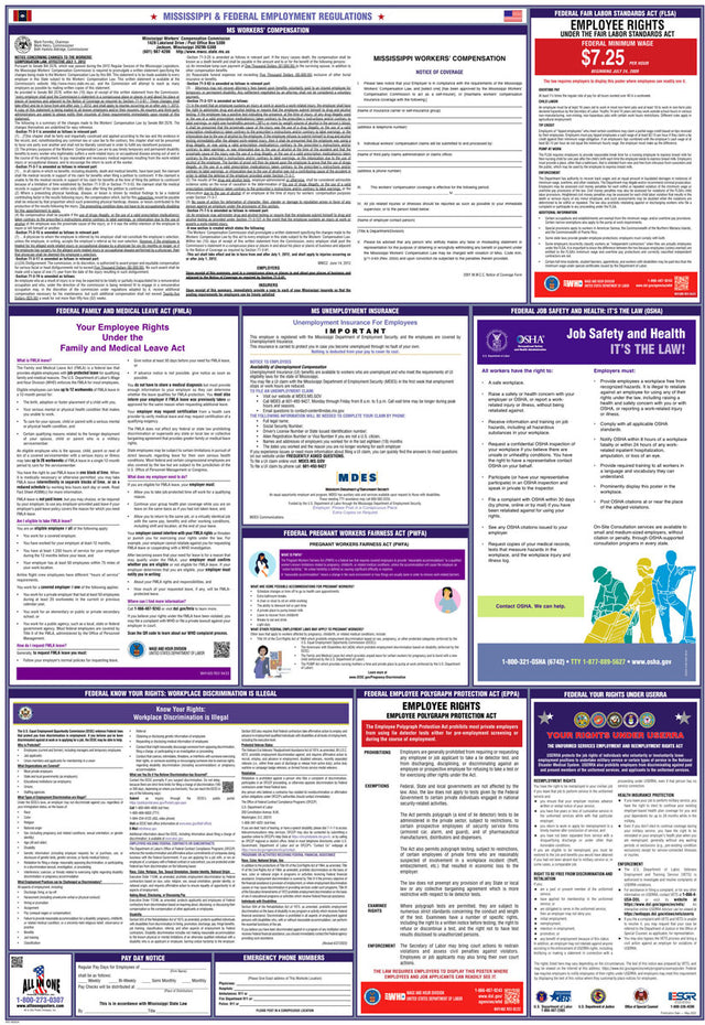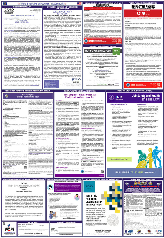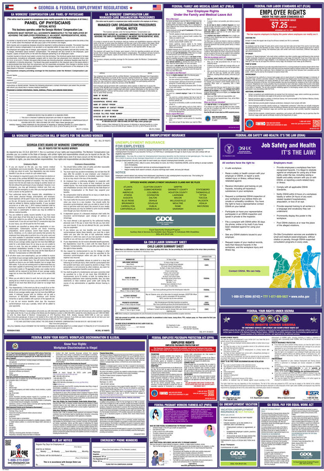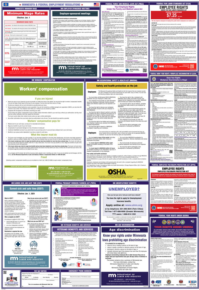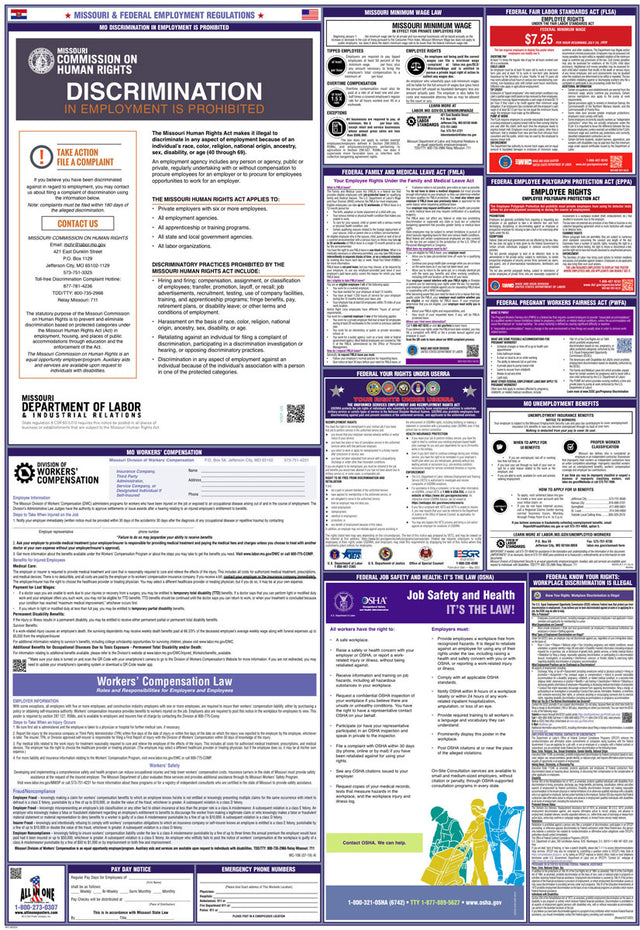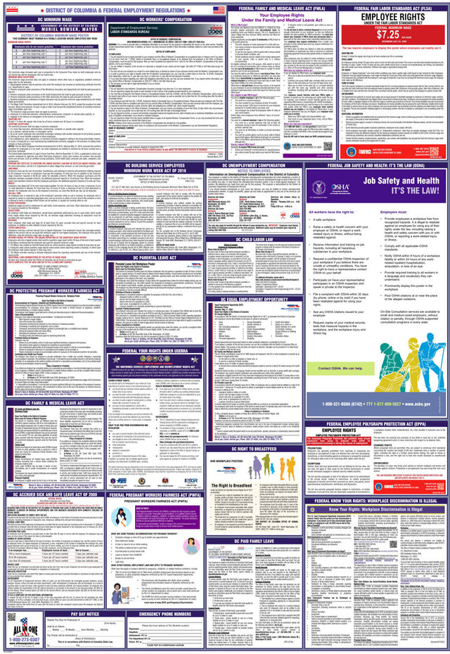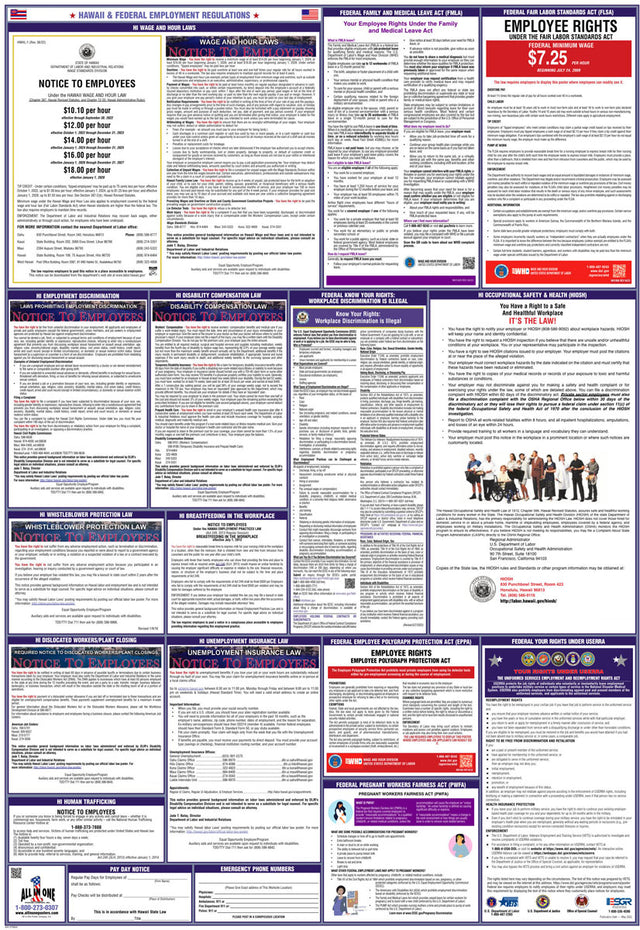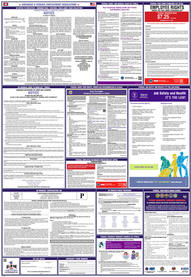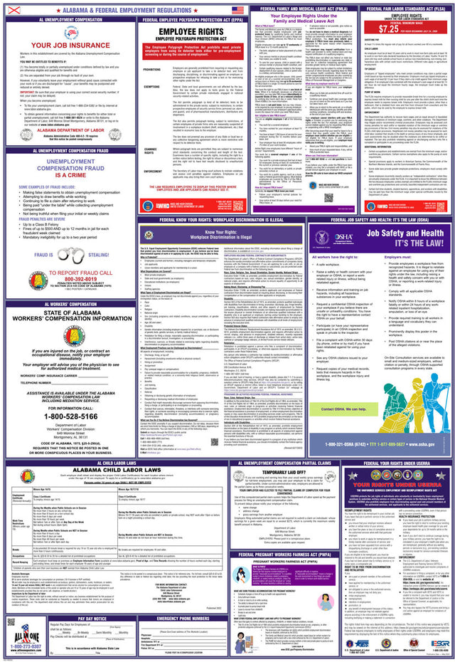 A combination state and federal compliance poster is a single poster that consolidates mandatory workplace postings required by both federal and state labor laws. These combination posters are convenient because they cover federal requirements, like those from the U.S. Department of Labor, and unique labor regulations that differ from state to state. At All In One Poster Company, we supply over fifty different state-and-federal combination compliance posters, unique to every single U.S. state, plus Puerto Rico and Washington D.C.