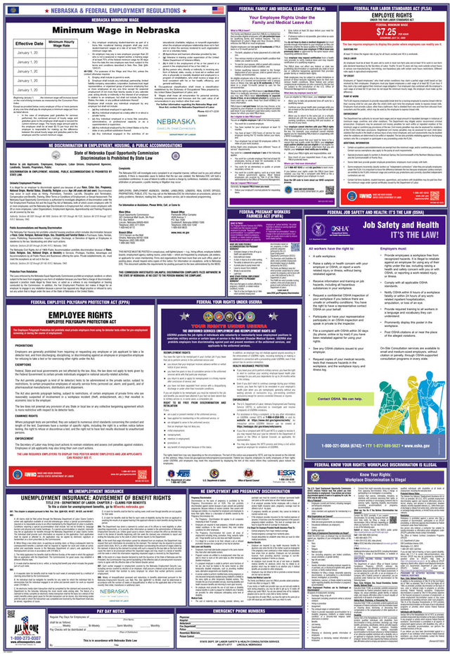 Ensure that your business remains compliant with federal and state labor law posters from All In One Poster Company. Labor law posters are informational visuals that help inform employees of their rights and protections. These posters provide details on a variety of topics, including wages, health and safety, anti-discrimination policies, and family leave rights. By law, these posters must be displayed in areas where employees can easily read them, such as break rooms or near time clocks, to ensure that your team members know their rights and protections.