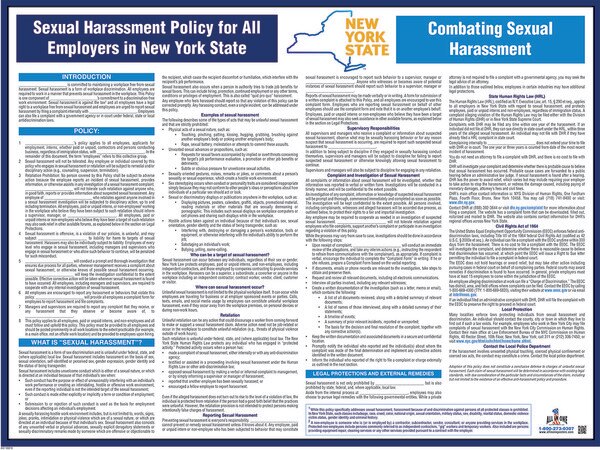 All In One Poster Company can streamline this process by providing a New York sexual harassment policy poster that features the State Model Policy. The New York State Model Sexual Harassment Prevention Policy is an official template that includes clear definitions of prohibited conduct, reporting procedures, training requirements, and more. To adopt the policies on these posters as their own, businesses can add their personal information into the black spaces throughout the poster. Displaying this poster in a common area not only helps meet legal obligations but also promotes a transparent and respectful workplace culture.