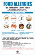 Our food allergy awareness poster lists the 9 major food allergies, symptoms of allergic reactions, ways to avoid cross-contamination, and how to respond to a customer. Educating employees about common food allergens helps businesses comply with FDA Food Code regulations and Food Allergen Labeling and Consumer Protection Act (FALCPA) guidelines. These posters also show commitment to accommodating customers and employees with allergies. Order your allergens posters from All In One Poster Company today.