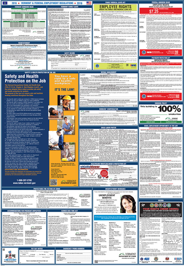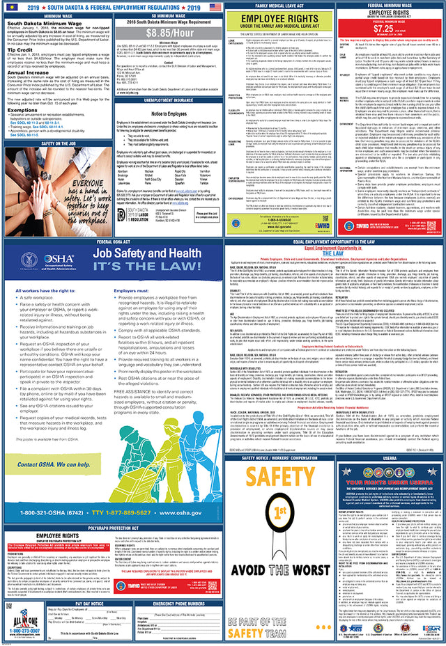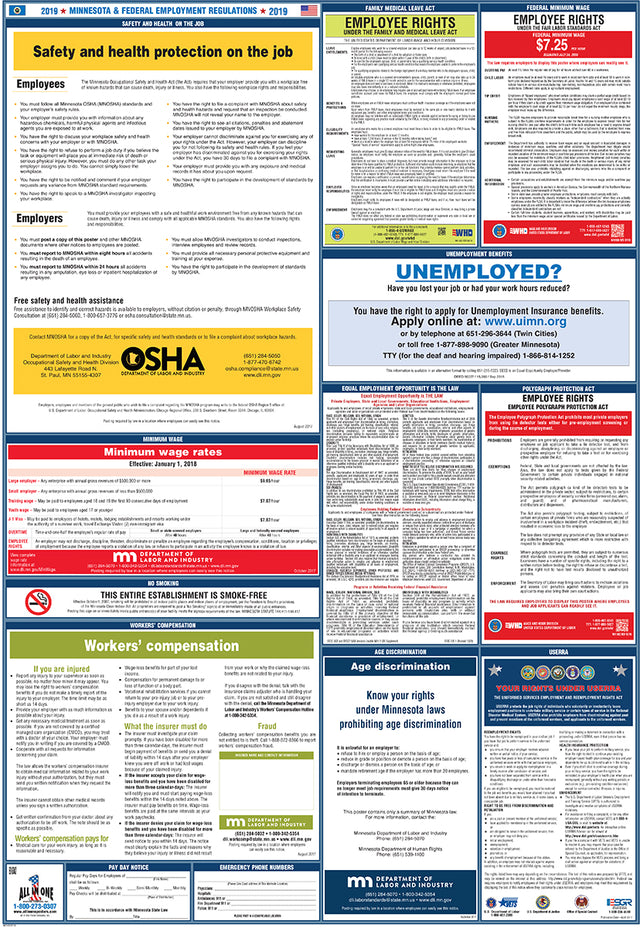 With the All In One Poster Company Compliance program, our team will monitor changes in labor laws for you. Subscribers will receive replacement posters whenever mandatory updates occur. Changes may happen multiple times per year, annually, or less frequently, depending on state or federal requirements. The very nature of these changes is quite unpredictable, except for a few that have yearly cycles, such as minimum wage increases in certain states.